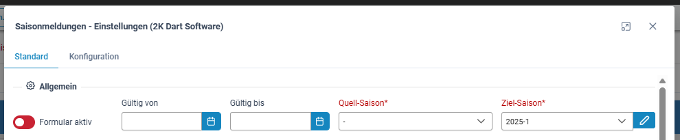 Durch drücken des Button "Einstellungen" öffnet sich ein Dialog, in dem alle Konfigurationen zur Saisonmeldung angegeben werden können, dieser ist in 2 Registern aufgeteilt.