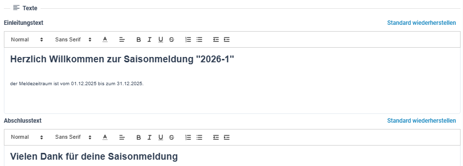 Danach können die Texte für die Einleitung, Abschluss und der Email an den Spieler angepasst werden, wenn der Button "Standard wiederherstellen" gedrückt wird, setzt das System einen fix hinterlegten Text mit den eingetragen Daten.