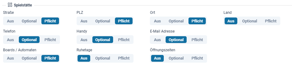 In dem Register "Konfiguration" können sämtliche Einstellungen für die Angabe der Daten getroffen werden, diese sind in unterschiedliche Bereiche aufgeteilt. Bei den meisten Daten kann die Prüfung anhand der Werte "Aus", "Optional" und "Pflicht" eingestellt werden.