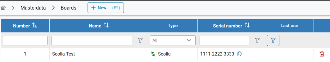 Now add your Scolia boards using the “New...” button. Enter the board number (number) and the serial number of the Scolia device, then click “Save”.