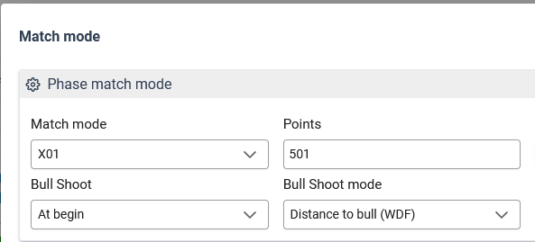 In the “Mode” tab, you can use “Match mode...” to set the options for the “bull throw” (determining the starting player by throwing the bull).