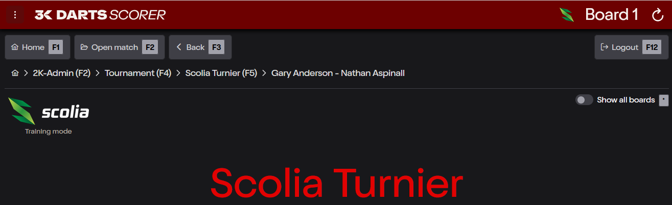 Important: The Scolia board is only applied when you log in or select the client. If you configure a board later in the backend (Step 1), you must log back into the 3K Darts Scorer!
