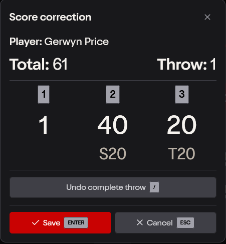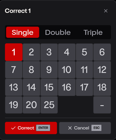 After throwing, click either “Correct” at the bottom of the screen or on the individual darts directly below the throw.