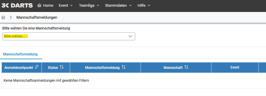 Damit Sie für ein Turnier eine Mannschaft melden können, müssen Sie zunächst die passende Meldung auswählen.