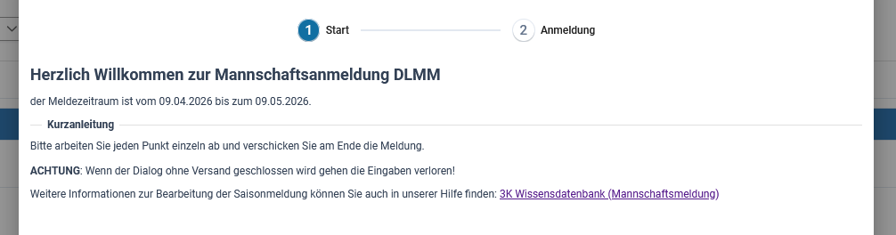 Anschließend erscheint der Button ‚Neue Mannschaftsmeldung‘. Beim Anklicken öffnet sich ein Dialogfenster zur Eingabe der Meldung.